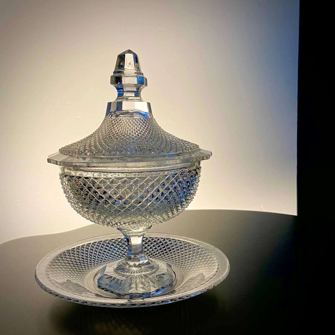 Хрустальная вазочка на поддоне Baccarat начала XX века (1910-1930гг), Франция. Диаметр блюда 20 см. Диаметр вазочки 16 см. Высота 26 см. Незначительные сколы по краю крышки.