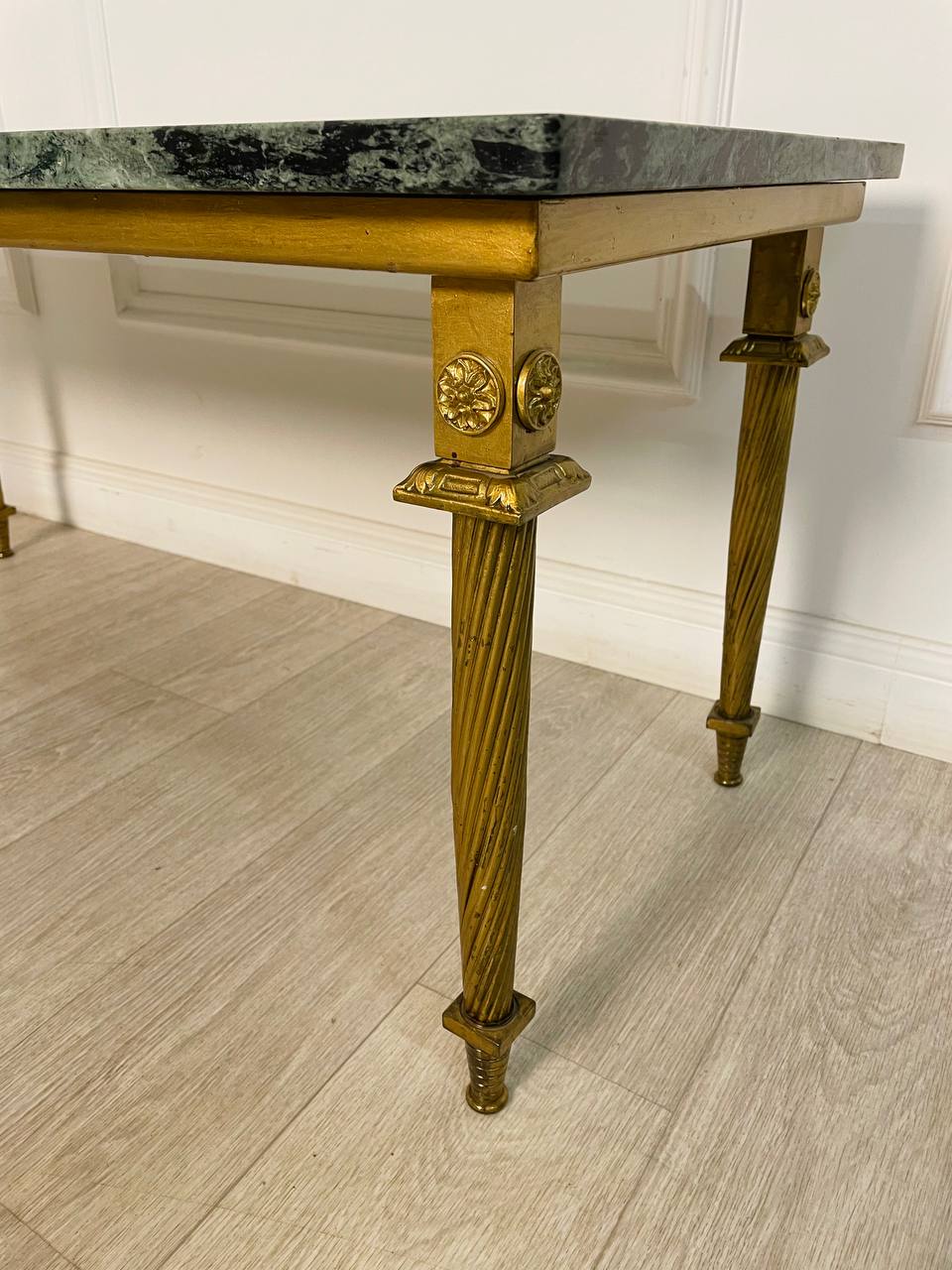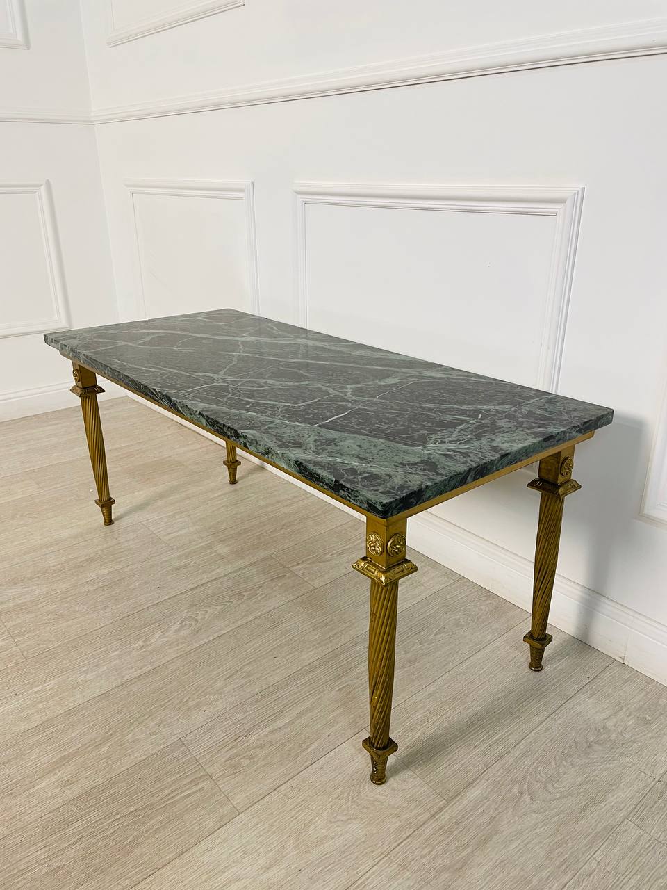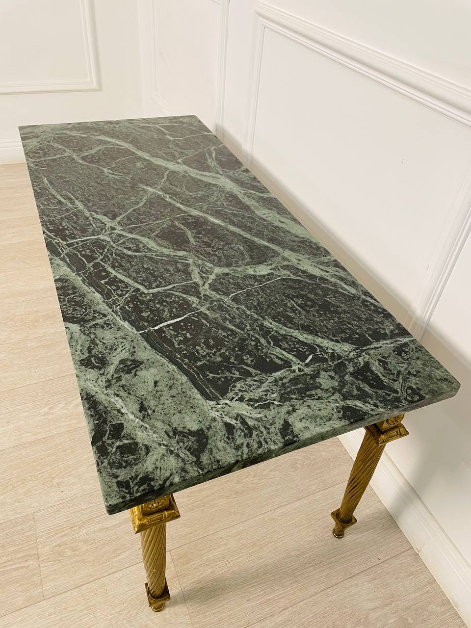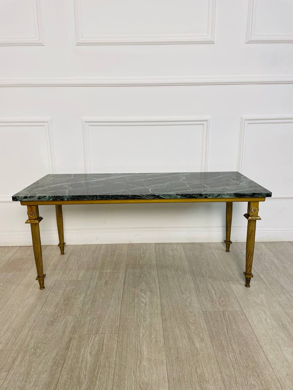 Винтажный журнальный столик стиле Hollywood Regency второй половины XX века, Бельгия. Выполнен из латуни и мрамора зелёного цвета. Есть небольшая склейка на столешнице. Размер 107х47х47h см.